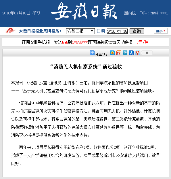 【安徽日报】365备用网址器研究项目“消防无人机侦察系统”通过验收