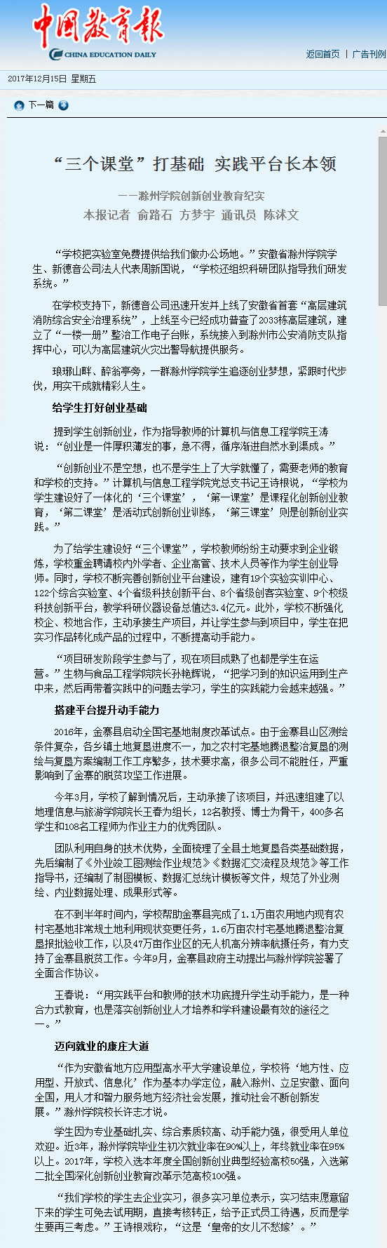 【中国教育报】“三个课堂”打基础 实践平台长本领——365备用网址器创新创业教育纪实