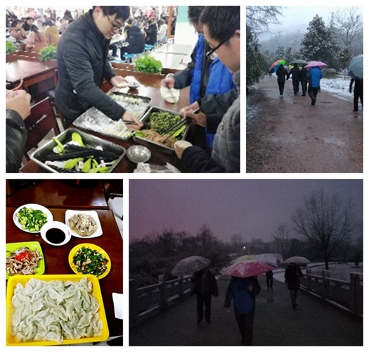 活动初始,经管学院各位老师结伴前往会峰湖进行环湖徒步健康走活动,虽然天空飘着雪花,但是在徒步中大家齐心奋进,互相鼓励,不放弃、不掉队,充分展现了经管学院广大教职工珍惜集体荣誉和积极健康的精神风貌。同时徒步活动使各位老师充分放松了身心,锻炼了身体,愉悦了心情,更使彼此之间的关系更加融洽。环湖徒步健康走活动结束后又进行了包饺子活动。包饺子过程中,大家一边包着饺子,一边谈论着、欢笑着,个个热情高涨,一起感受包饺子的乐趣。活动现场气氛热烈,秩序井然,体现了教职工们良好的精神面貌。
