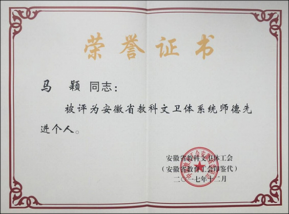 日前,安徽省教科文卫体工会发布《关于推荐评选全省教科文卫体系统职业道德先进个人的通报》,我校马克思主义学院副教授马颖荣获安徽省教科文卫体系统“师德先进个人”称号。