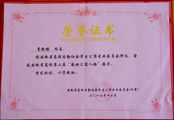 日前,安徽省高校后勤协会学生公寓专业委员会第二届“感动公寓人物”揭晓,我校后勤服务中心托管项目监管部副主任胥艳鹏从全省高校20位候选者中脱颖而出,成功当选“感动公寓人物”。